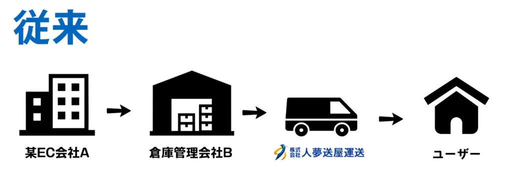 人夢送屋運送ではこれまで、お客様からお預かりした荷物を配達する「配送業務のみ」を中心に行っていました。倉庫管理や出荷作業はお客様側で対応されるケースが多く、当社はあくまで最終工程として荷物を受け取り、指定先まで安全にお届けする役割を担っていました。